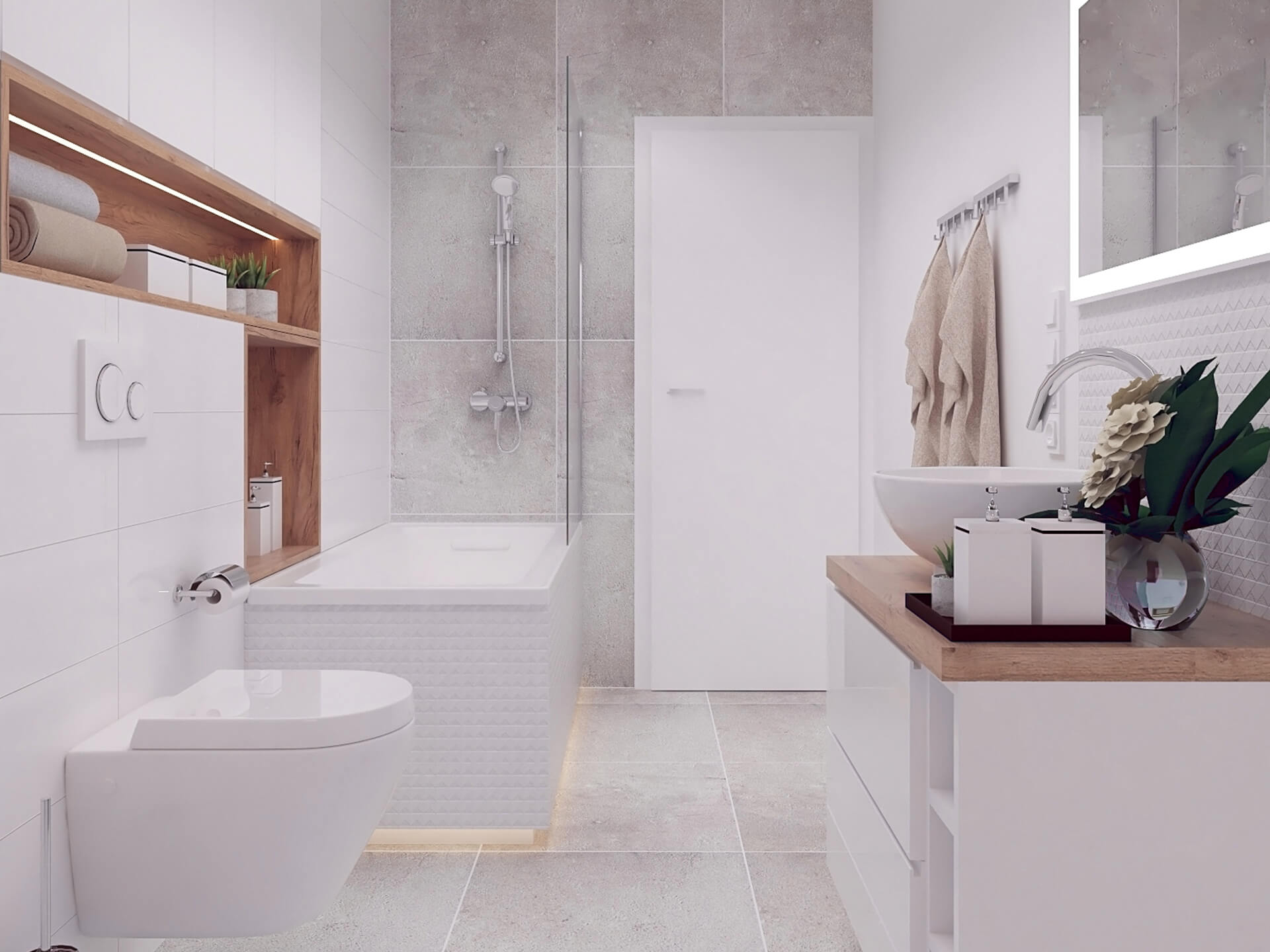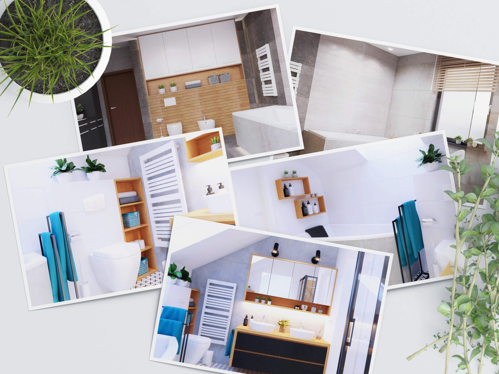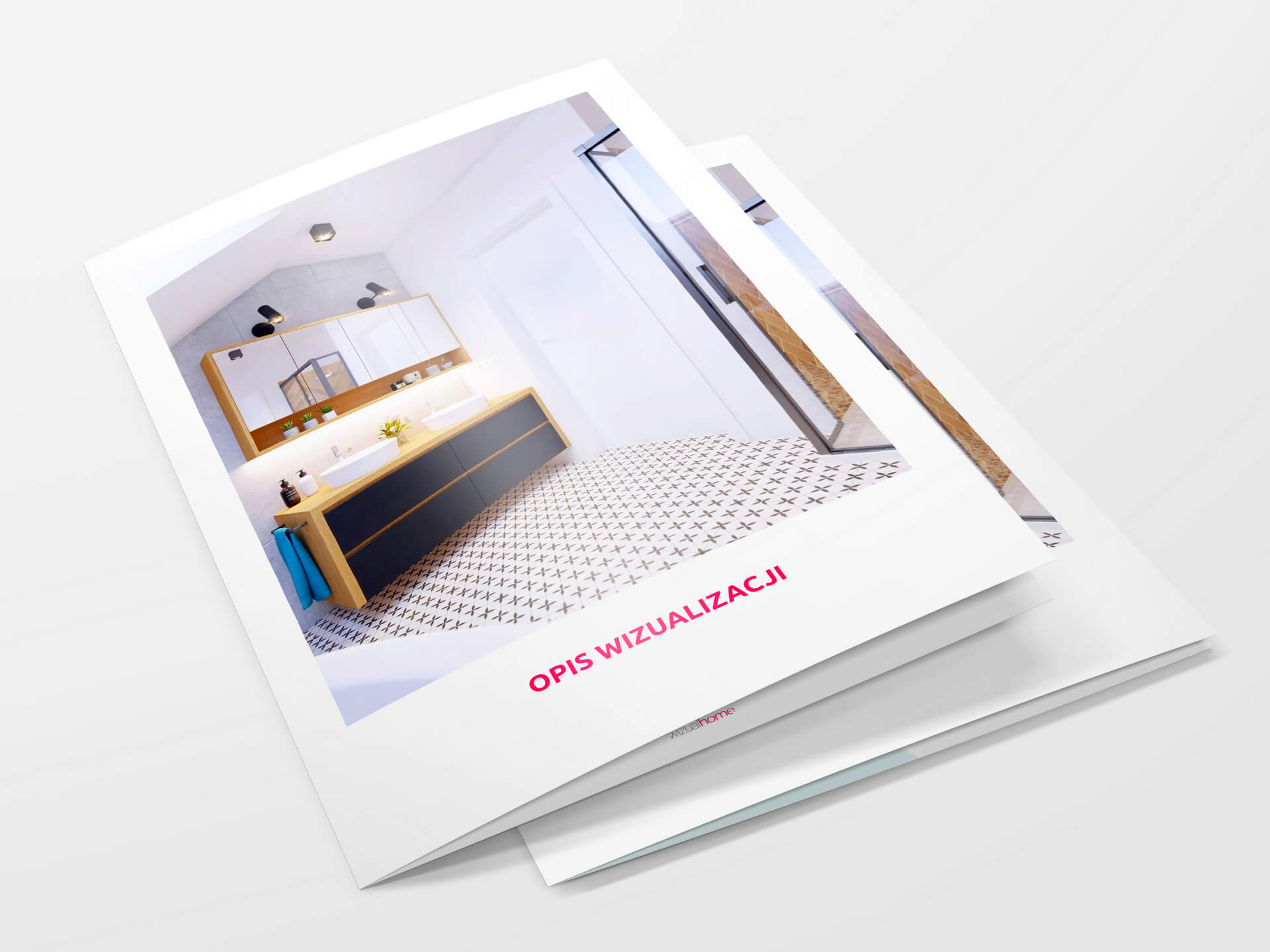 Pakiet wizualizacji składa się z 4-6 kadrów projektowanej łazienki, opisu wizualizacji w formie pdf oraz szablonu listy zakupów do samodzielnego wypełnienia.