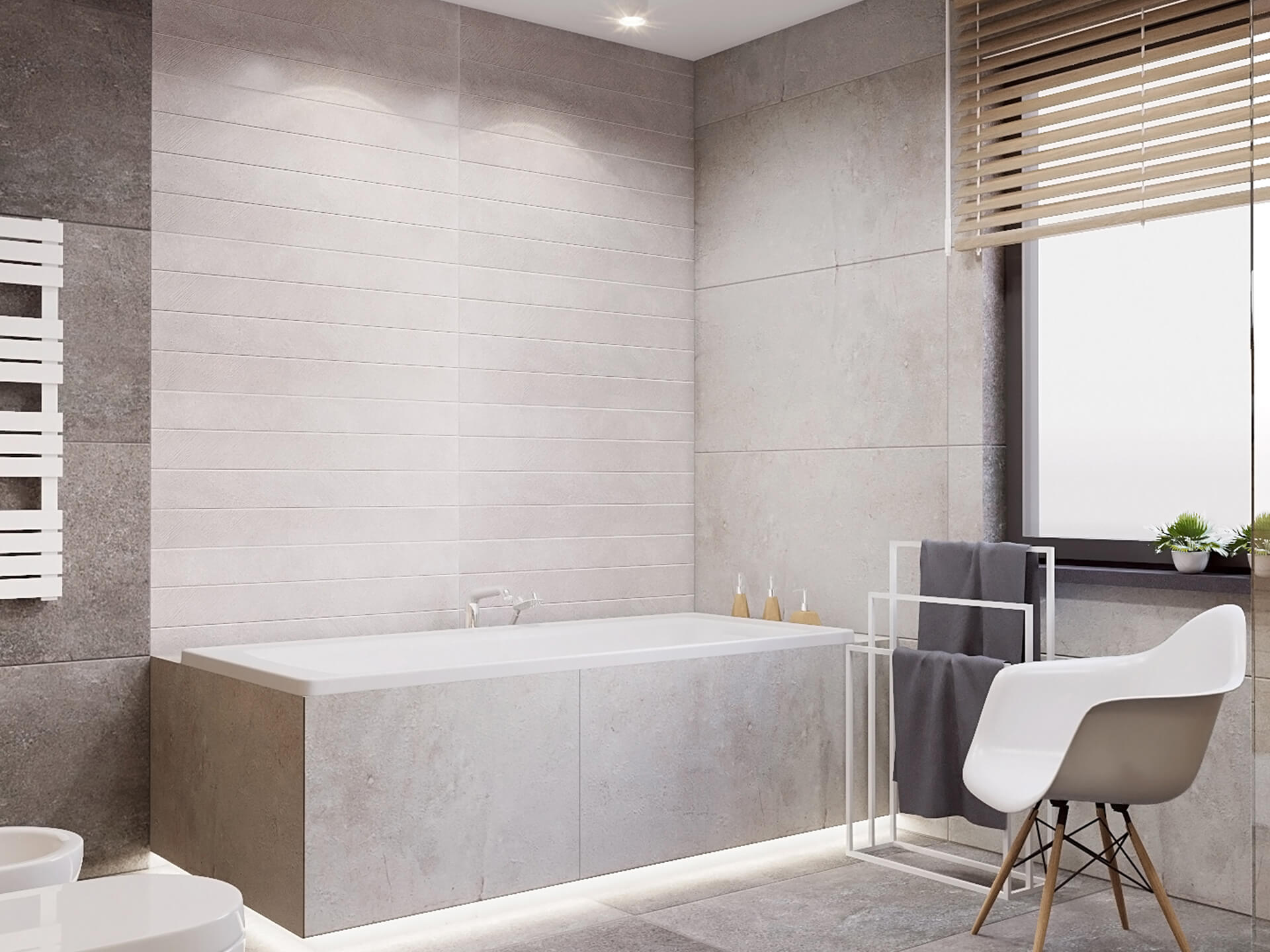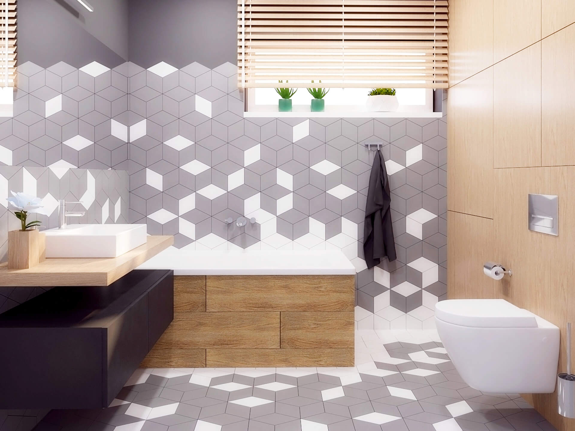 Do pakietu wizualizacji łazienki możesz dodatkowo dokupić rysunek układu płytek, tak by wykonawca mógł na jego podstawie prawidłowo ułożyć wzór płytek na posadzce i ścianach.